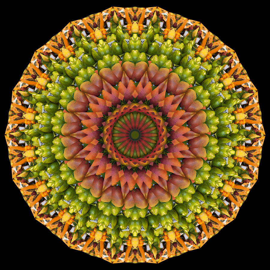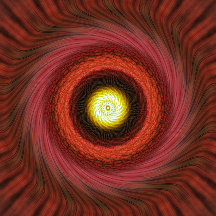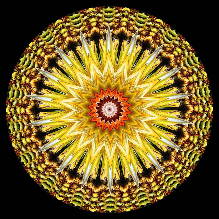 It would be impossible to describe all the possible ways in which you might approach the final processing of a kaleidoscopic image. What follows are just a few possibilities along with some images which have been altered significantly after the kaleidoscope has been produced. All of them are composites of 2 or more kaleidoscopes and all had colour and tonal adjustments.
