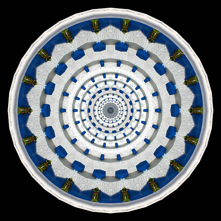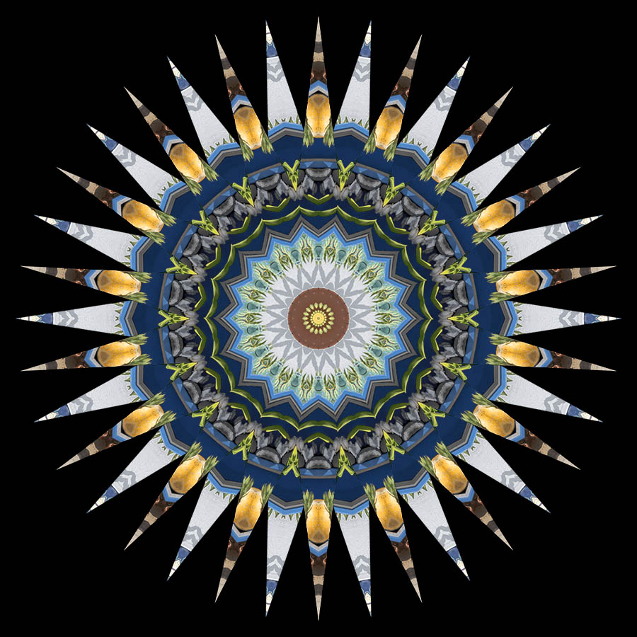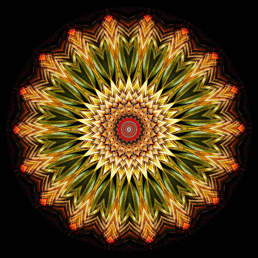 Often you will be happy with PART of the kaleidoscope. For example, the centre might be great but the rest isn’t or vice versa. So long as the colour scheme is compatible, it’s relatively easy to use the centre (or any other area) from one image and overlay that in another. I find that centred, circular masks of different sizes are often best as they preserve the integrity of the kaleidoscope in terms of its symmetry. The Flipped Symmetry function is particularly useful for creating kaleidoscopes which will merge easily with other kaleidoscopes.